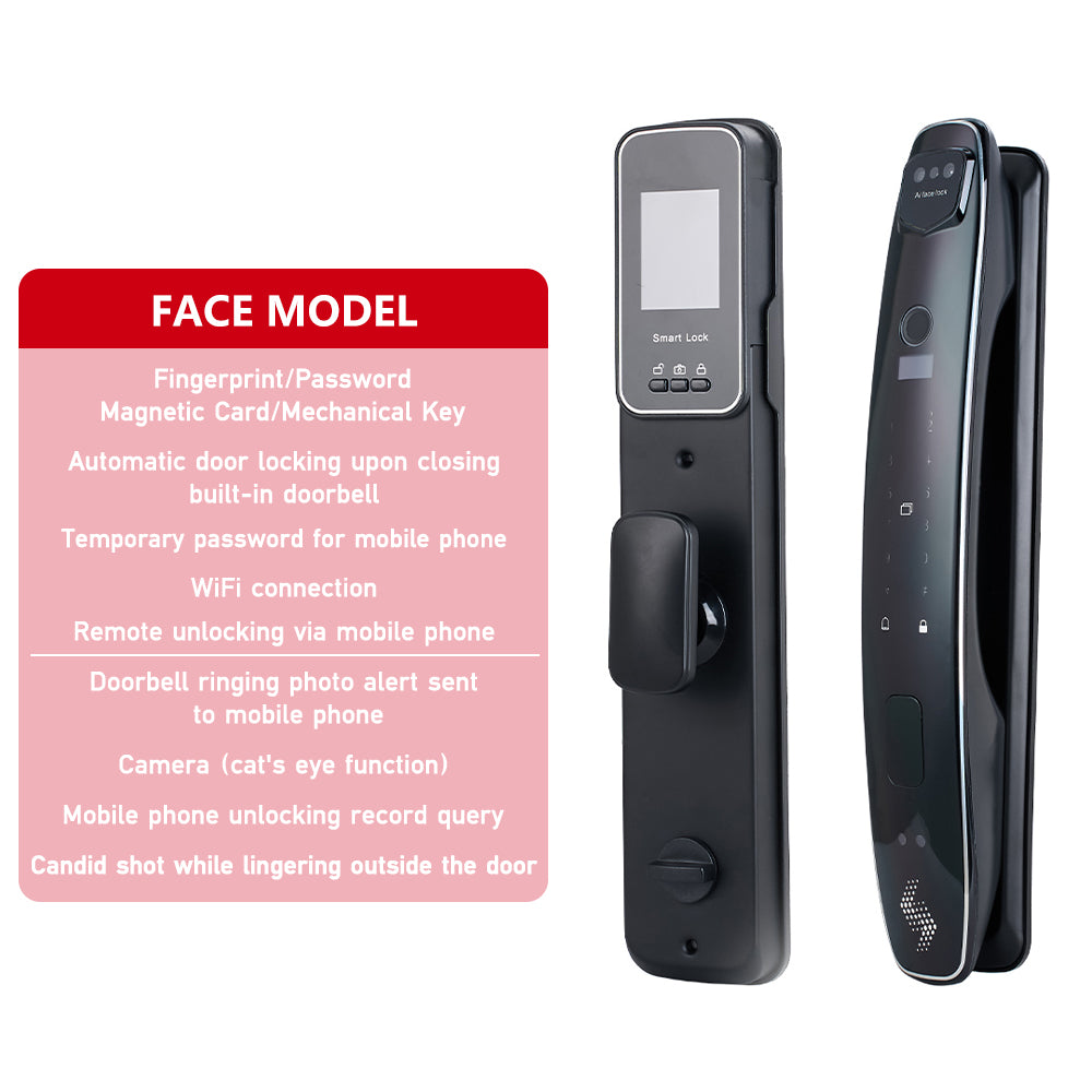 Unlock Methods: 3D Facial Recognition, Fingerprint, Password, Card, Mechanical Key, Temporary Passcodes and Remote Unlocking via APP
