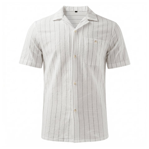 This short-sleeve shirt is a must-have piece for your summer wardrobe. Made from a cotton and polyester blend, it is comfortable, breathable, wrinkle-resistant, and easy to care for. The classic stripe design offers a sharp yet refined look. The Cuban collar breaks away from the stiffness of traditional shirts, giving it a relaxed, vacation-ready vibe. Whether you need to dress for business occasions or want to pull off a casual weekend street look, this shirt handles it with ease — a versatile piece that combines practicality with fashion.