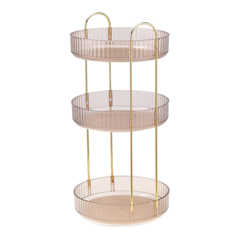 Keep your cosmetics beautifully organised with our 360-degree rotating organiser! This elegant piece blends plastic trays with golden metal supports, creating a luxurious look that complements any home decor. The three-tier circular design holds everything from skincare to jewellery, keeping your surface tidy and maximising space. With unobstructed trays, you can quickly spot and grab your favourite products. Perfect for any sized bathroom, this organiser adds a touch of style to your routine while bringing order and beauty to your space.