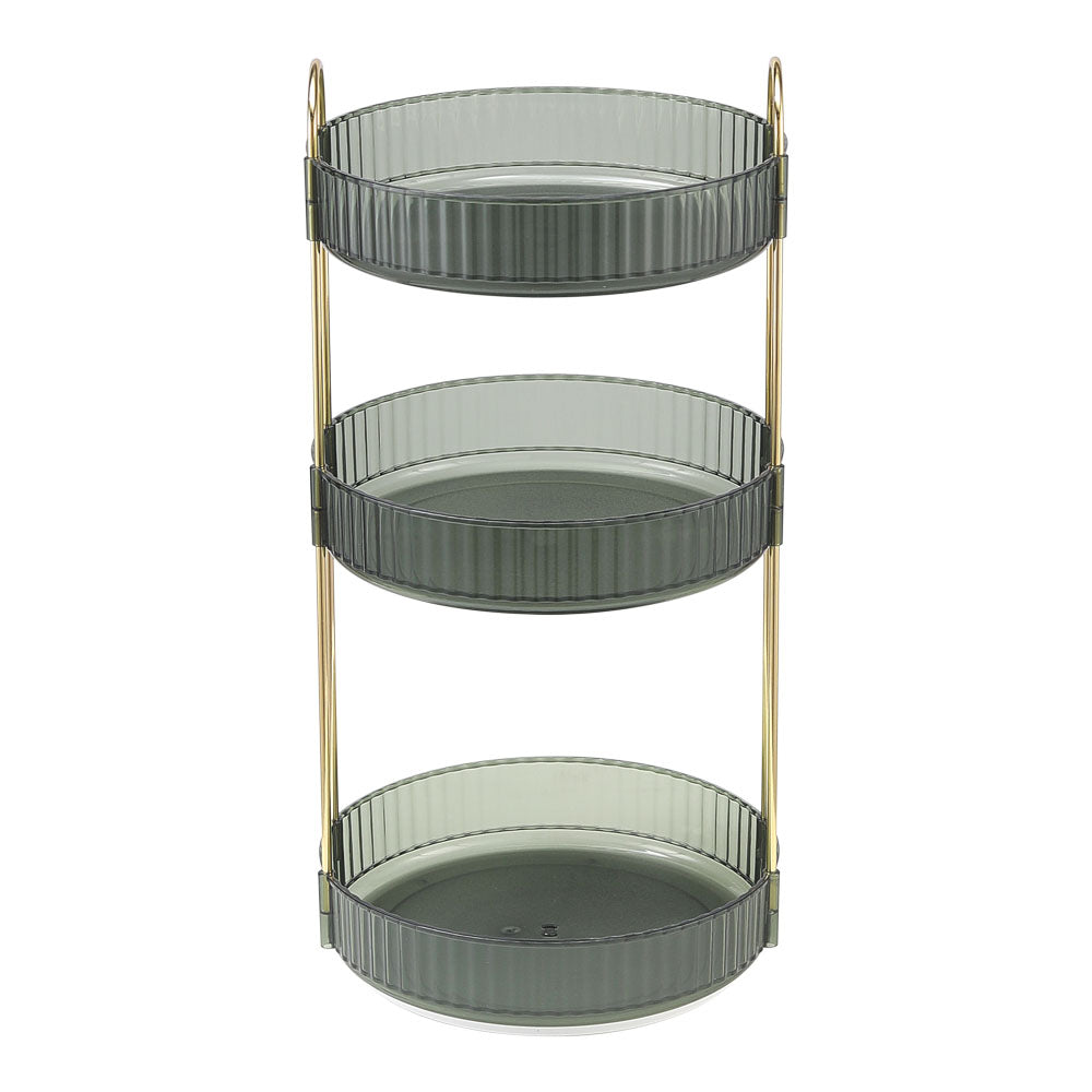 Keep your cosmetics beautifully organised with our 360-degree rotating organiser! This elegant piece blends plastic trays with golden metal supports, creating a luxurious look that complements any home decor. The three-tier circular design holds everything from skincare to jewellery, keeping your surface tidy and maximising space. With unobstructed trays, you can quickly spot and grab your favourite products. Perfect for any sized bathroom, this organiser adds a touch of style to your routine while bringing order and beauty to your space.