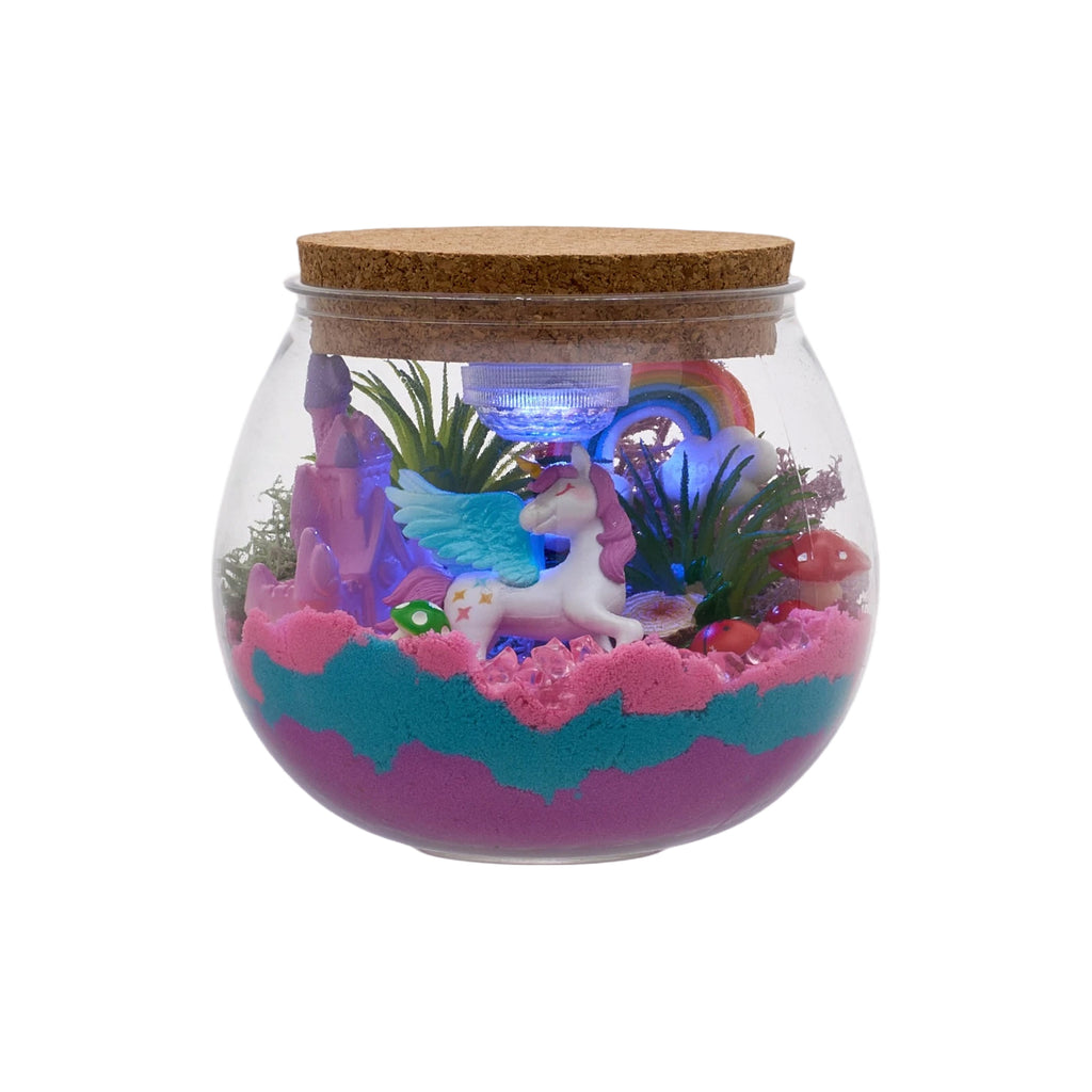 Unleash a world of magic and light with this enchanting DIY terrarium kit! Inside a charming vessel, children can craft their own enchanted forest using vibrant kinetic sand, moss, and shimmering beads. Adorn this miniature landscape with a purple unicorn, a tiny castle, a rainbow bridge, mushrooms, and a ladybird to create a truly imaginative scene. Topped with a remotely controlled LED light that emits a gentle glow, the entire display comes to life after dark. Perfect for parent-child bonding, holiday gifting, or as a personalised night light, this kit sparks creativity while delivering endless wonder.