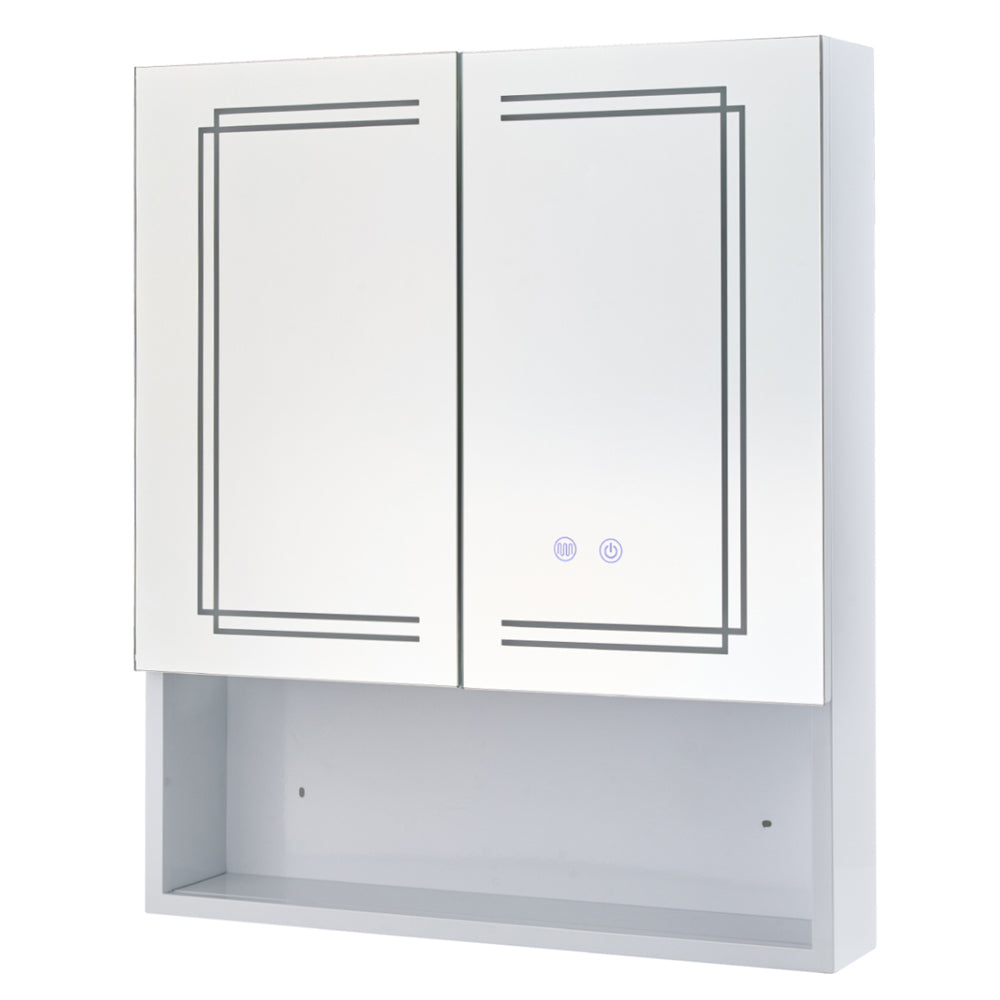This LED bathroom mirror cabinet features a smart design for efficient organisation. The upper section includes a height-adjustable glass shelf above a fixed base, providing two levels of concealed storage. Below, an open compartment with an integrated lighting strip keeps everyday essentials clearly visible and within easy reach, even in low light. Integrated mirror lighting offers three adjustable colour temperatures, operated via a sleek touch control. With an IP44 rating, it is protected against moisture and splashes for reliable bathroom use.