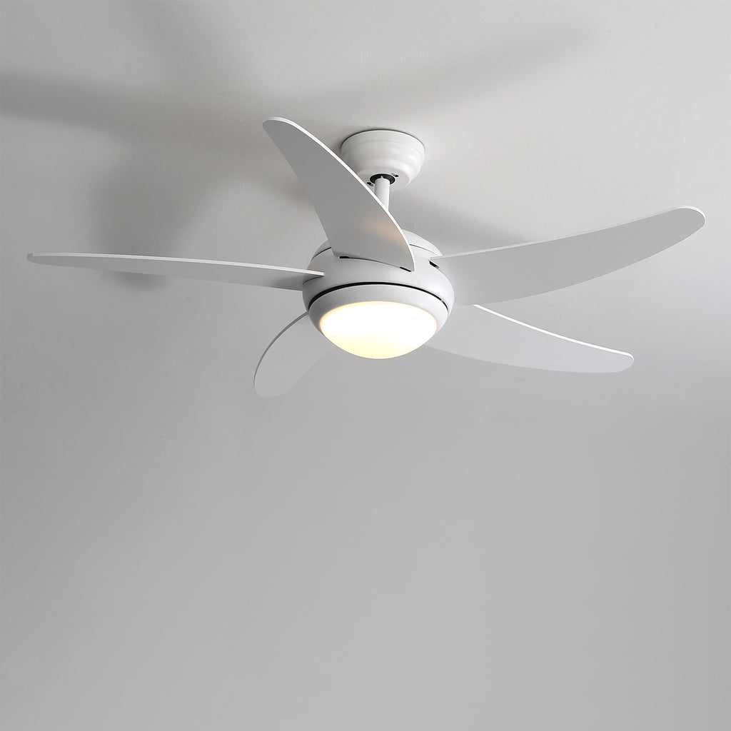 With its casual modern style, this ceiling fan will complement your living space in an effortless way. 5 metallic blades designed with a subtle blade-like profile enhance its look. Equipped with a remote, you can sit on the couch and adjust the speed mode of the fan. The installation is quite simple, so you can enjoy the breeze right away.