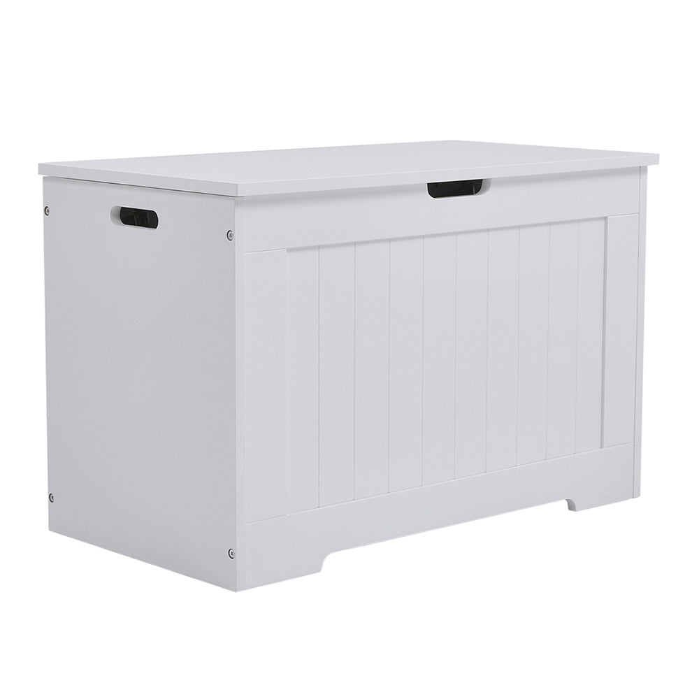 A sleek storage chest that combines modern design with efficient functionality. The crisp white finish blends effortlessly with various interior styles, offering a versatile addition to any room. Vertical slats on the front add a subtle yet captivating detail, enhancing the visual appeal and giving the piece a unique charm. The lift-up lid opens smoothly, providing easy access to the spacious interior. With integrated handles for a simple, streamlined look, this chest offers both style and practicality. Perfect for keeping clothes, bedding, toys, or seasonal items neatly stored, it brings order and tidiness to bedrooms, living rooms, or any room.