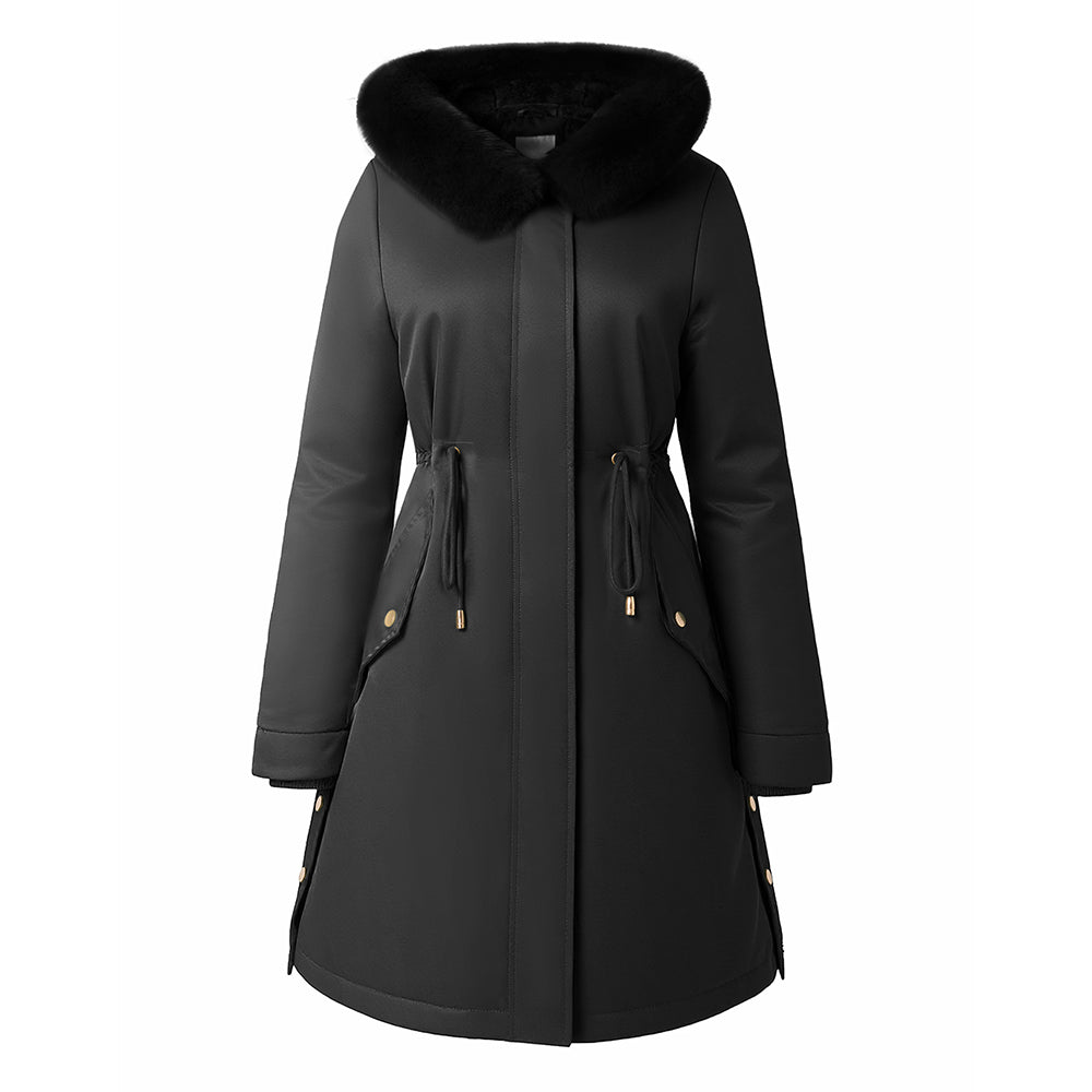 Embrace winter in style with this chic and fitted coat for the discerning woman. Designed for both elegance and warmth, its flattering silhouette and smooth lines create a sophisticated and feminine look. The generous faux fur collar adds a touch of luxury while keeping your neck cosy, complemented by a wonderfully soft, insulating lining for ultimate comfort. A practical drawstring waist allows for a customisable fit, cinching your figure beautifully for a look that is both fashionable and functional. Perfect for commutes, dates, or everyday wear, this coat is your go-to for elevated warmth and style this autumn and winter.