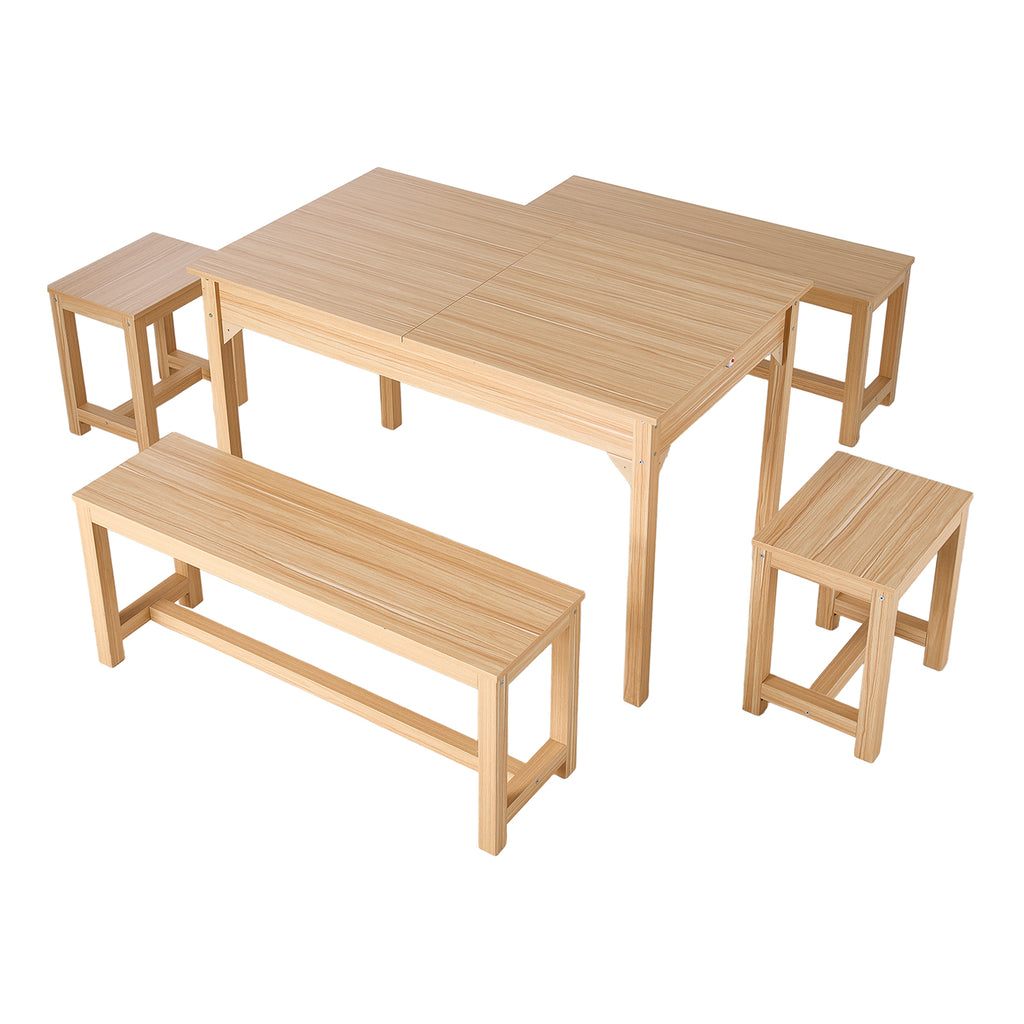 Discover a dining and chair set that blends natural beauty with functionality. Adorned in a warm wood tone, it retains the original texture and colour of wood, fitting any home decor. It includes a spacious dining table, two single stools, and two benches, making it versatile for not just dining but also as a computer desk, study desk, or coffee table to meet various needs. The highlight of the dining table lies in its extendable design, which allows the length to transform between 120 cm and 160 cm, adapting to different dining capacities and space requirements. Ideal for daily meals or family gatherings, this set offers both versatility and comfort, enhancing your home life.