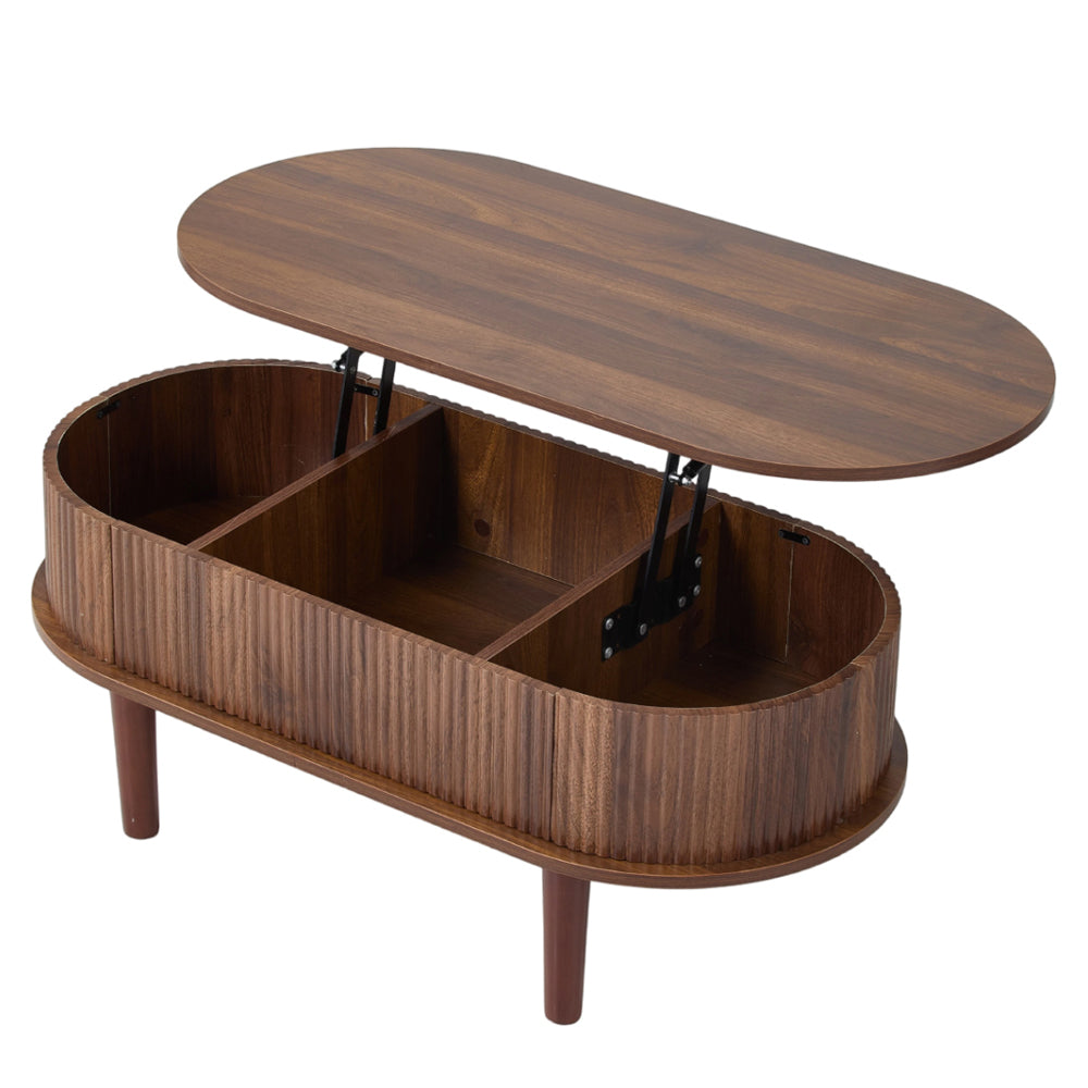 Embodying minimalist spatial aesthetics, this coffee table pairs mid-century modern elegance with practical functionality. Its fluted wood panel with soft curved edges adds refinement, while vertical wave textures introduce visual depth. The lifted top rises to 54 cm, transforming easily into a dining or workstation surface. Hidden beneath is a neatly divided storage compartment for books, remotes and essentials. More than a coffee table, it blends leisure, dining and work into one versatile piece—perfect for living rooms, studies or bedrooms.