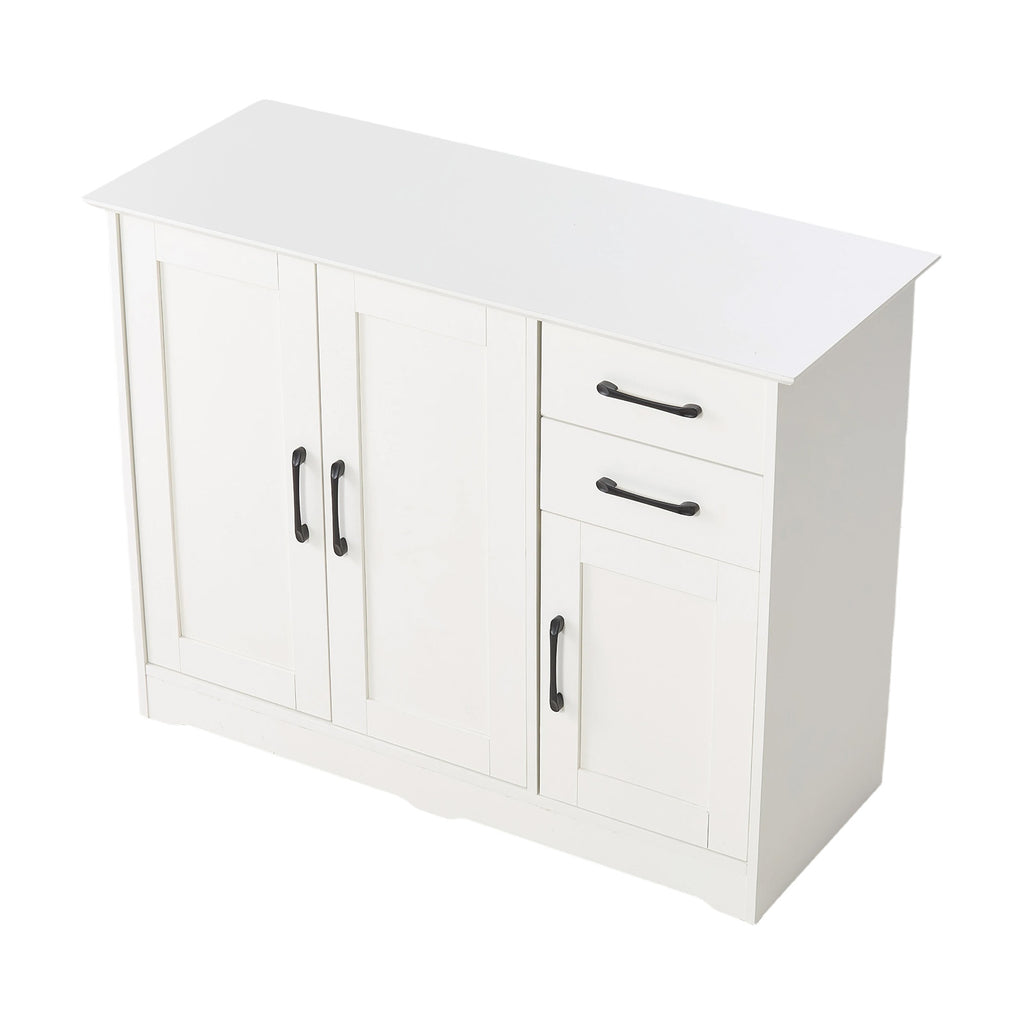 This sideboard features a modern, minimalist design that blends practical storage with decorative appeal. Its flat top surface offers space for displaying decor, tableware, or small appliances, maximising utility. The left compartment includes a double-door cabinet with an adjustable shelf inside, while the right side features two smooth-gliding drawers and a separate cabinet for versatile organisation. Each door and drawer is fitted with a pull handle for effortless operation. Perfect for storing everyday essentials or showcasing favourite items, it helps keep your home tidy and elegant.