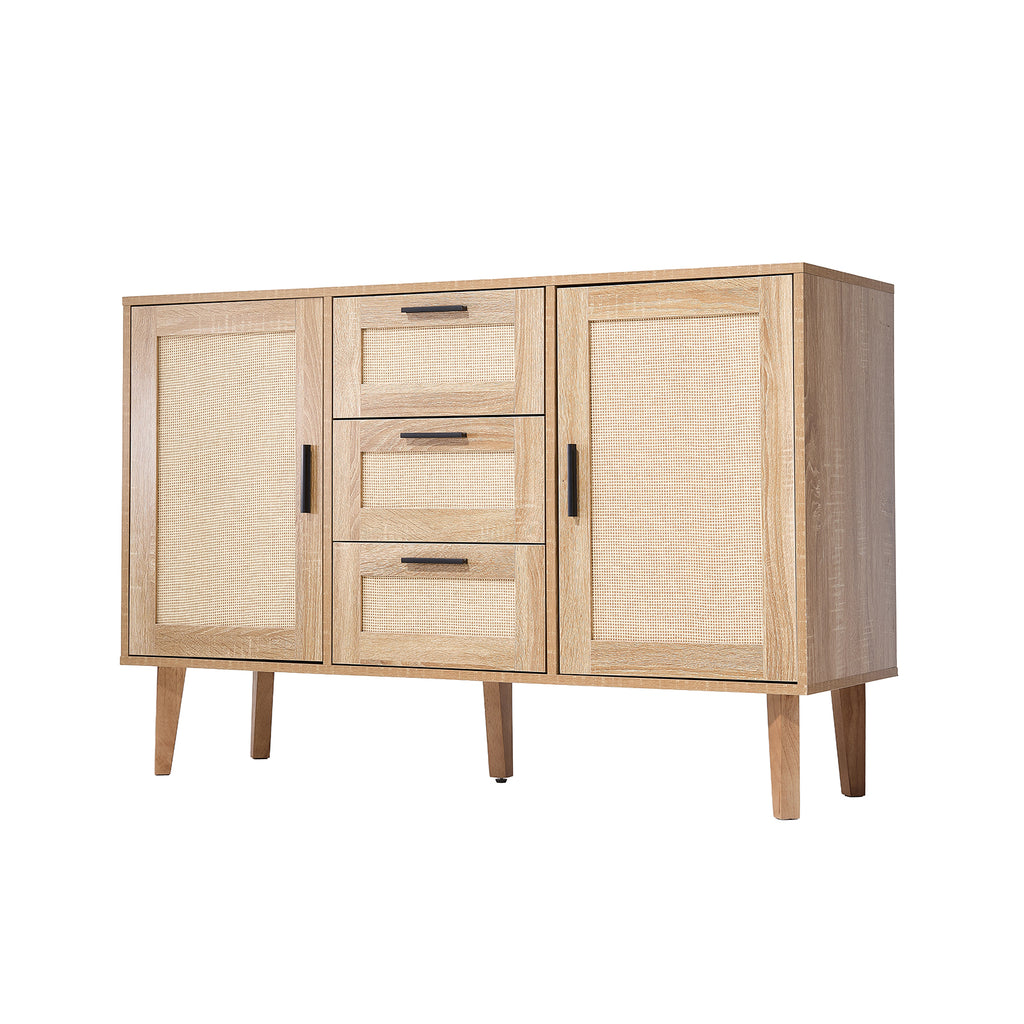 This storage cabinet combines natural style with practicality—perfect for dining rooms, living rooms, or kitchens. Featuring elegant faux rattan woven panelling, it effortlessly adds a touch of rustic charm to any space. The flat top surface doubles as a display platform—perfect for plants, photo frames, or decorative accents. On either side are two single-door cabinets, complemented by three smooth-gliding drawers in the centre, offering organised storage for everyday essentials. Each door and drawer is fitted with a handle for effortless, smooth operation. Additionally, sturdy wooden legs provide stable support, enhancing both load-bearing capacity and overall safety.