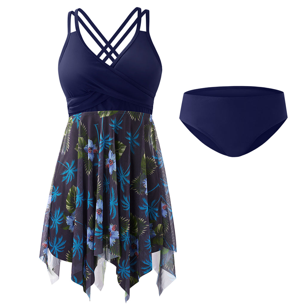 Elegant in deep blue, this one-piece swim dress exudes summer charm. Featuring a sophisticated blend of a deep blue base with teal tropical florals and palm prints, it offers a fresh yet refined look. The V-neck wrap design flatters the neckline and enhances the bust, while the crisscross back straps provide support and reveal a stylish open-back silhouette. A high-stretch waistband contours the torso, smoothing the midsection for a slimmer, more graceful profile. Plus, the flowing skirt adds movement and romantic resort-style flair. Perfect for swimming, sunbathing, beach volleyball, spa days, or tropical getaways—it is versatile, confident, and effortlessly chic.