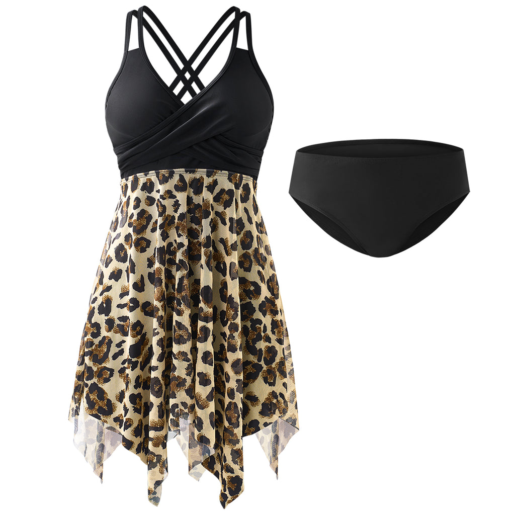 Elegant in black and brown, this one-piece swim dress exudes bold summer style. Featuring a sleek black top with a flowing leopard-print skirt, it offers a chic and daring look. The V-neck wrap design flatters the neckline and enhances the bust, while the crisscross back straps provide support and reveal a stylish open-back silhouette. A high-stretch waistband contours the torso, smoothing the midsection for a slimmer, more graceful profile. Plus, the flowing skirt adds movement and romantic resort-style flair. Perfect for swimming, sunbathing, beach volleyball, spa days, or tropical getaways—it is versatile, confident, and effortlessly chic.