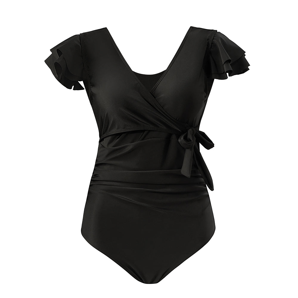 Designed to highlight your curves with confidence, this one-piece swimsuit combines elegance with everyday comfort. Made from premium nylon and spandex, it offers excellent stretch and long-lasting shape retention. The flattering V-neckline elongates the silhouette, while the wrap-style cut and soft built-in cups provide gentle support and natural shaping. Subtle waist ruching creates a smoothing, tummy-control effect. Full-coverage bottoms contour the hips for a confident fit, making them ideal for swimming, sunbathing, or seaside strolls.